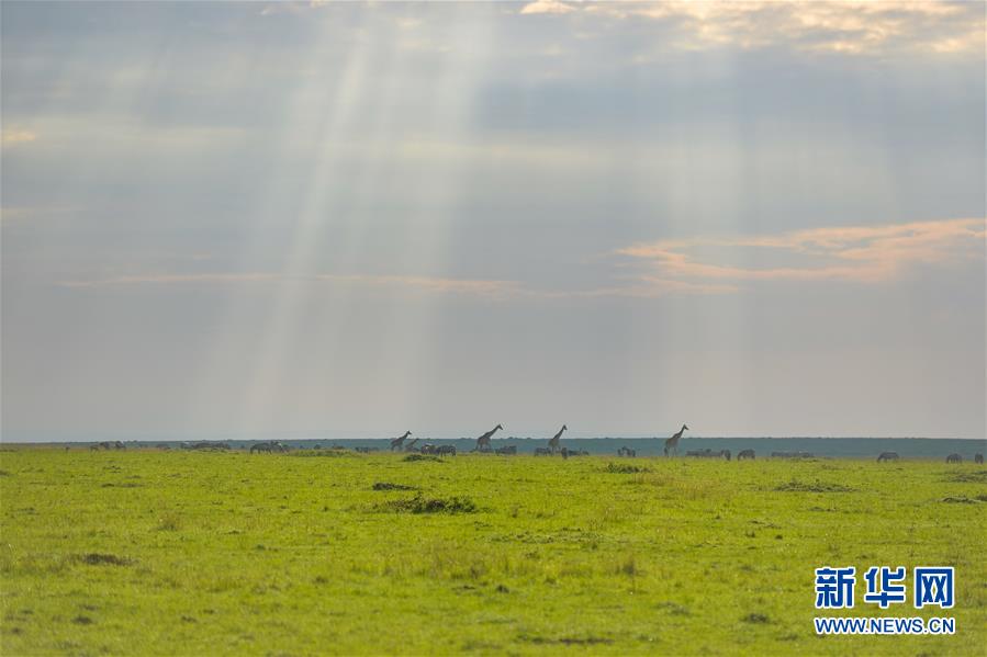 6月18日,在肯尼亞馬賽馬拉國家保護區(qū),長頸鹿在草原上覓食。 新華社記者 李琰 攝