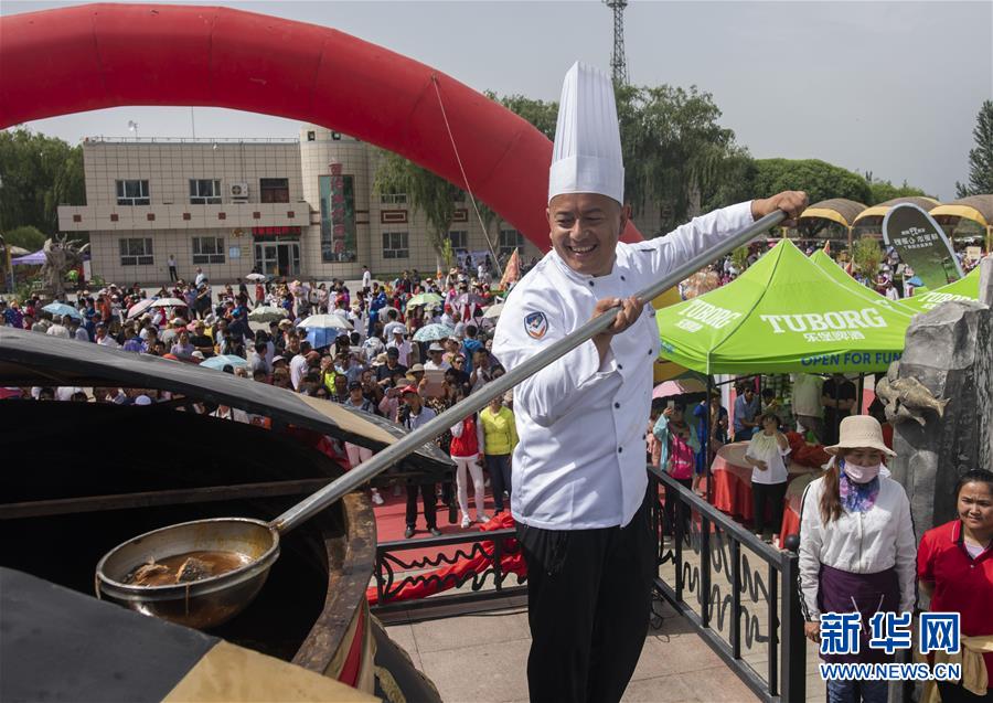 6月22日,在博斯騰湖開湖儀式上,一名廚師舀起剛剛烹制好的魚。新華社記者 趙戈 攝