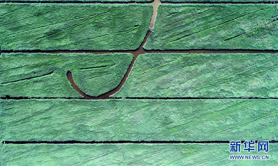 這是天津市寧河區(qū)七里海濕地內(nèi)蘆葦和水面形成的圖案(6月22日無人機拍攝)。新華社記者 岳月偉 攝