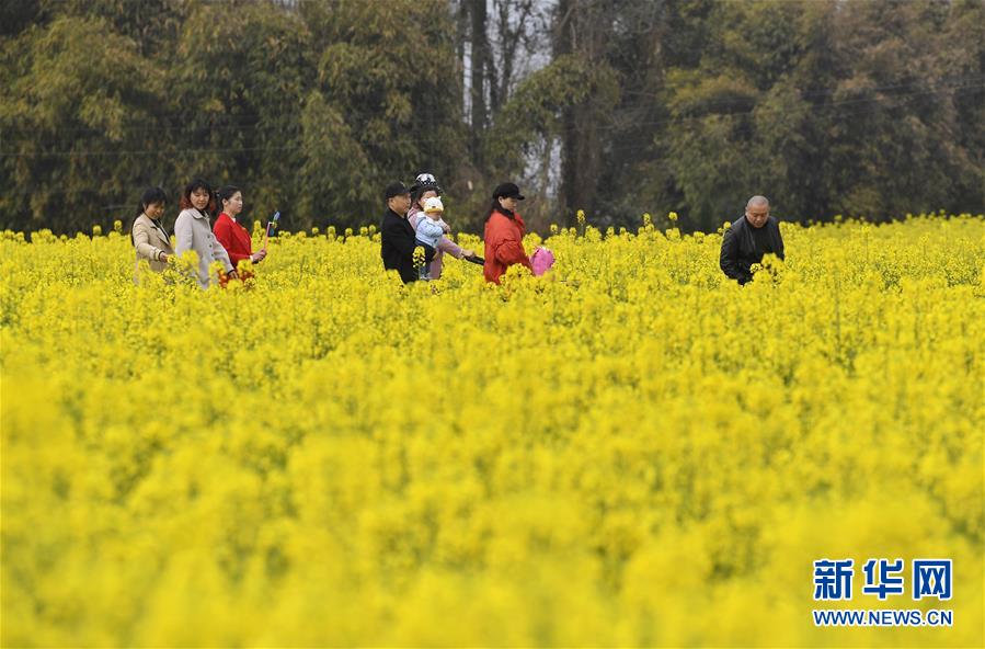 3月6日,游人在四川廣漢市西高鎮(zhèn)的油菜花公園里游玩。 新華社記者劉坤攝