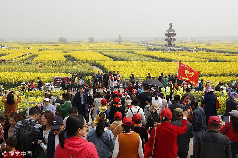 2019年4月7日,江蘇省興化市千垛菜花景區(qū)迎來旅游高峰期,數(shù)萬游客前來欣賞盛開的油菜花,樂享假日好時(shí)光。