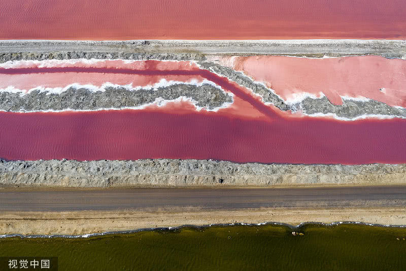當(dāng)?shù)貢r間2019年6月11日,航拍納米比亞沃爾維斯灣五彩鹽田。鹽田總面積達(dá)3500公頃(35平方千米),南非近90%的鹽都由該地供應(yīng),鹽田中生長的海藻和鹽濃度不同造成鹽田呈現(xiàn)出多種色彩,照片由自由攝影師Franco Cappellari使用無人機(jī)拍攝。