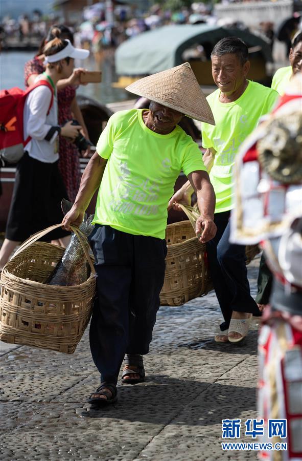 7月27日,在西昌邛海,幾名漁民提著捕到的大魚準(zhǔn)備參加比賽。新華社記者江宏景攝