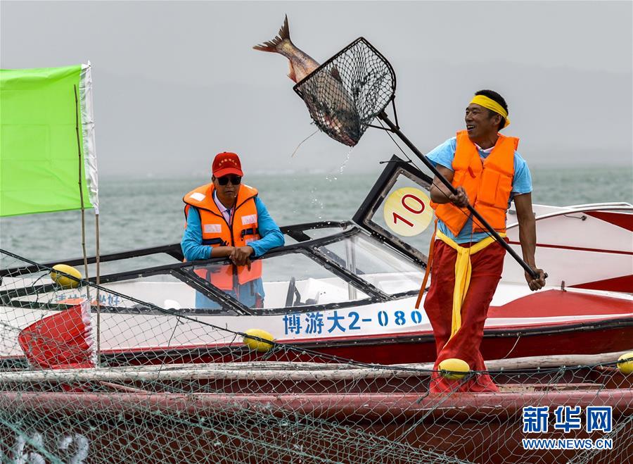 2019年6月22日,博湖縣的魚把頭將開湖季打的第一網(wǎng)魚撈起。新華社記者趙戈攝