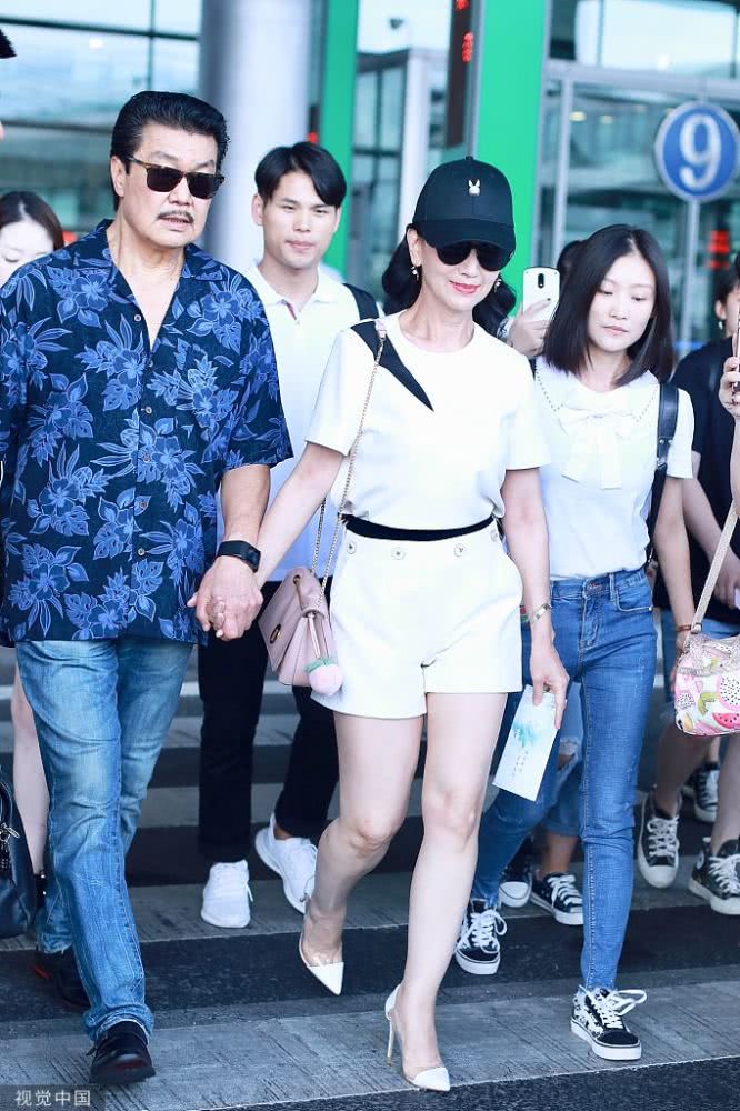 2019年8月10日,北京,趙雅芝與老公黃錦燊現(xiàn)身機(jī)場(chǎng)。