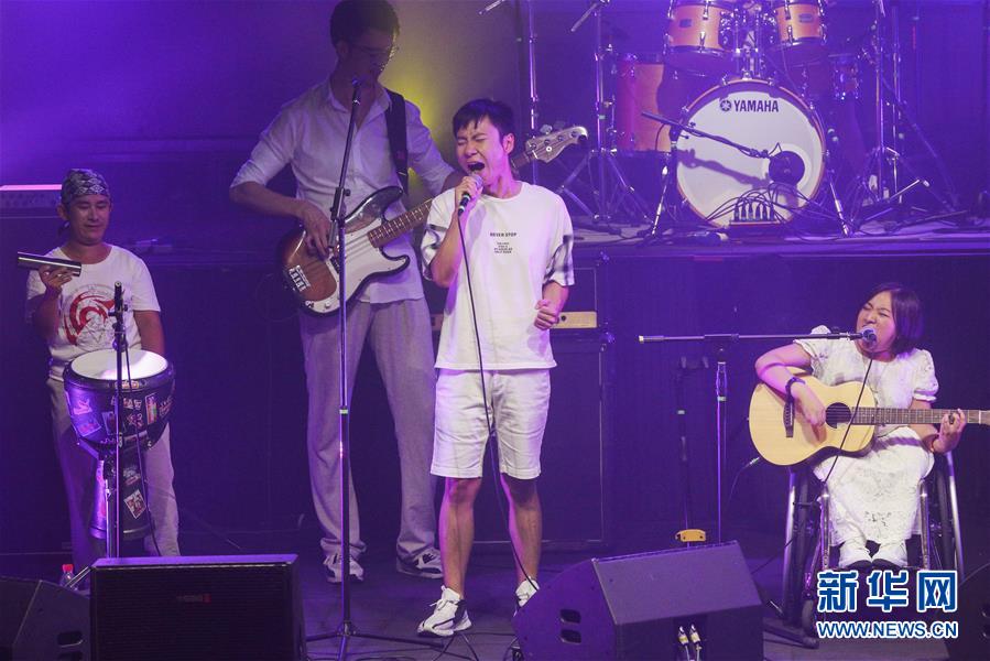 8月14日,8772樂隊(duì)成員田霄(中)在演唱會(huì)上表演。新華社記者張玉薇攝