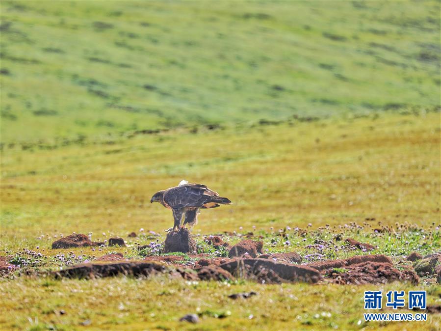 一只大鵟準(zhǔn)備享用捕獲的獵物(8月14日攝)。 8月12日至14日,來自全國各地的31名自然愛好者聚集在海拔4200米的青海省玉樹藏族自治州稱多縣嘉塘草原,參加“2019嘉塘自然觀察節(jié)”。自然愛好者用獨(dú)特視角記錄珍稀野生動植物,觀察三江源生態(tài)。 新華社記者 張大川 攝