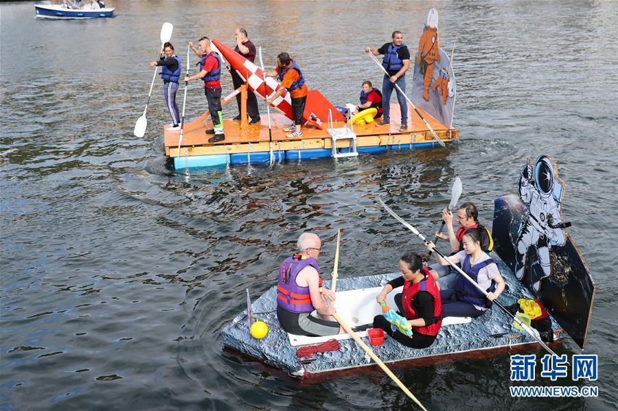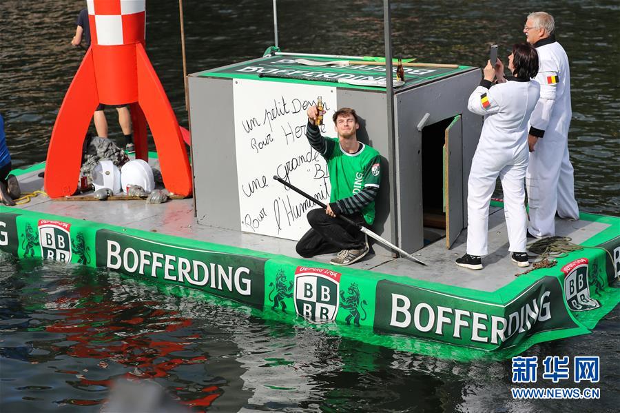 當(dāng)日,一年一度的水上狂歡活動(dòng)“浴缸劃船節(jié)”在比利時(shí)迪南舉行。該活動(dòng)要求參賽者制造的船上至少帶有一個(gè)浴缸,參賽者需完成一千米的水上巡游,最后根據(jù)設(shè)計(jì)創(chuàng)意及現(xiàn)場表演而非行進(jìn)速度評選出優(yōu)勝者。“浴缸劃船節(jié)”始于1982年,今年的主題是"我們在月球漫步"。 新華社記者 張鋮 攝