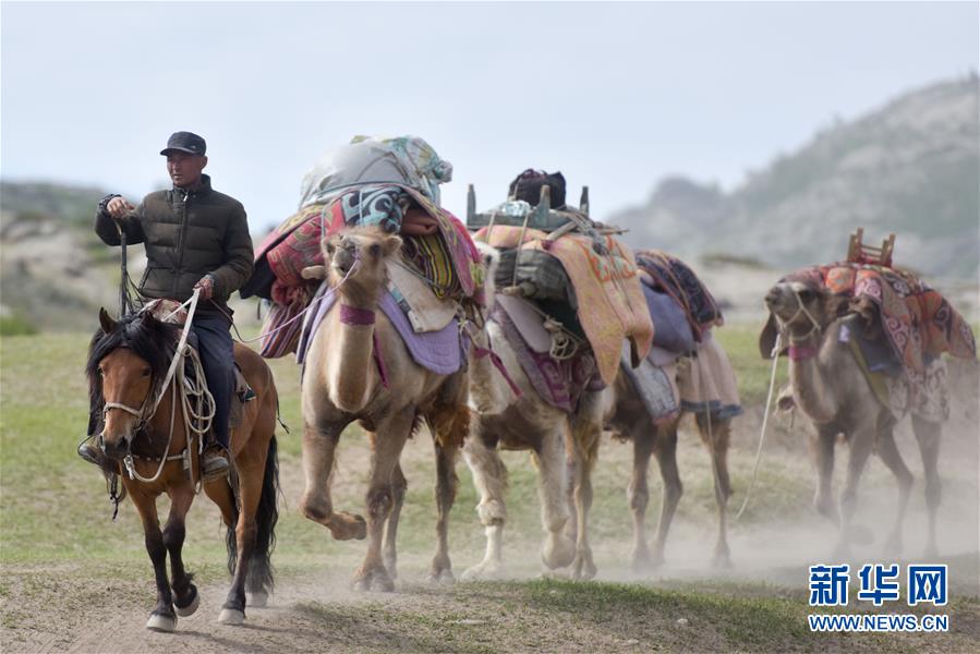 新疆阿勒泰地區(qū)福海縣牧民帶著駝隊(duì)行進(jìn)在轉(zhuǎn)場(chǎng)途中(6月6日攝)。新華社記者丁磊攝