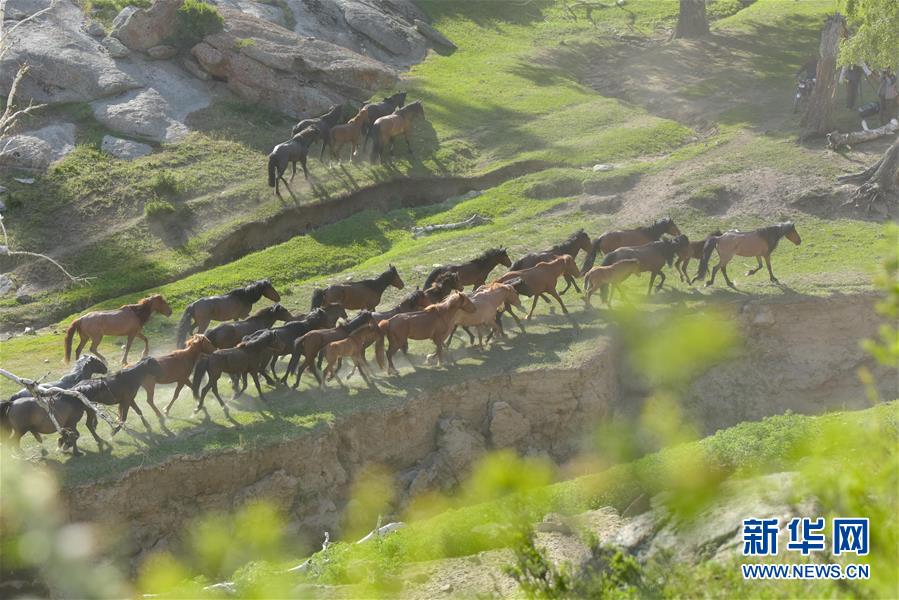 這是牧道上轉(zhuǎn)場(chǎng)的馬群(6月6日攝)。新華社記者丁磊攝