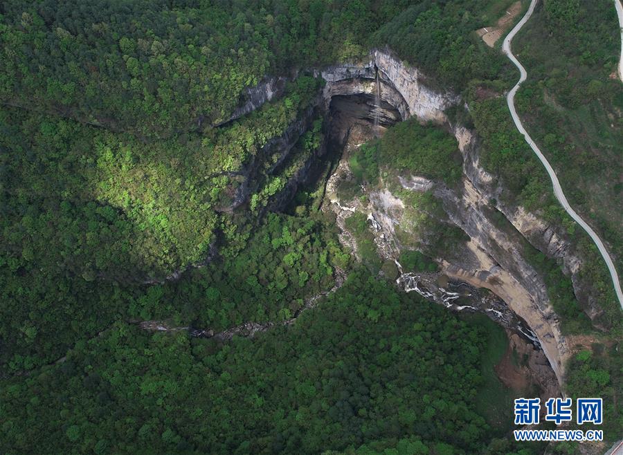 4月22日無人機(jī)拍攝的地洞河天坑。 新華社記者 張博文 攝