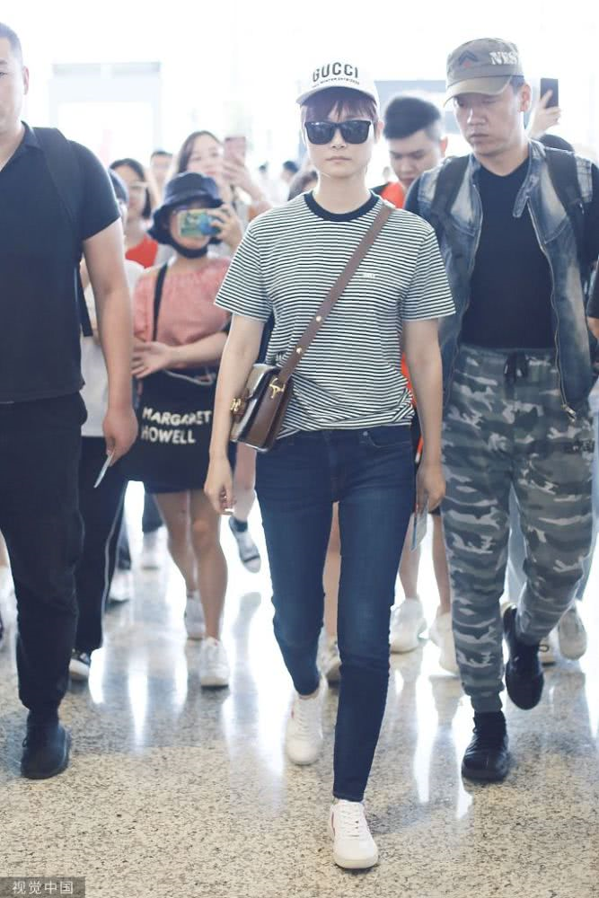 李宇春條紋裝扮現(xiàn)身機場,青春活力,人氣爆棚