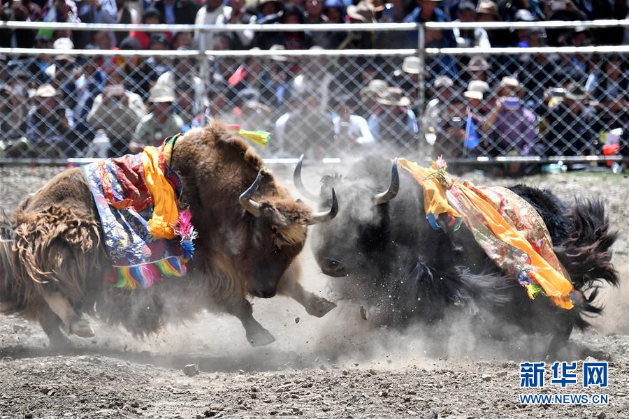 者下鄉(xiāng)斗牛節(jié)歷史悠久,是西藏自治區(qū)非物質文化遺產(chǎn)。牧民為參加比賽的種牦牛披綢掛緞,將牛群趕到位于日喀則市白朗縣者下鄉(xiāng)的斗牛場上。參賽的種牦牛為了爭奪牛群的控制權,在成群的母牛面前,更加好斗。角斗有的瞬間分出勝負,有的持續(xù)幾十分鐘,最終勝出的被稱為“牦牛至尊”。