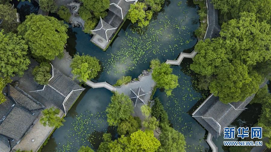 這是5月21日拍攝的蘇州拙政園局部(無(wú)人機(jī)拍攝)。 新華社記者 沈伯韓 攝