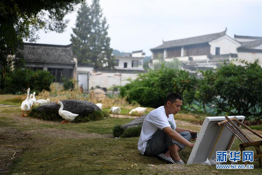 游客在呈坎村內(nèi)寫(xiě)生(8月28日攝)。新華社記者劉軍喜攝