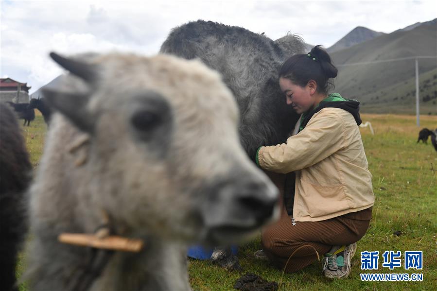 9月8日,在四川省康定市呷巴鄉(xiāng)俄達(dá)門巴村附近,一名藏族姑娘給牦牛擠奶。新華社記者孫瑞博攝
