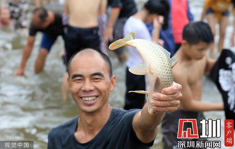 一名村民在廣西柳州市融安縣安寧村大袍屯“鬧魚”活動中展示抓到的活魚。