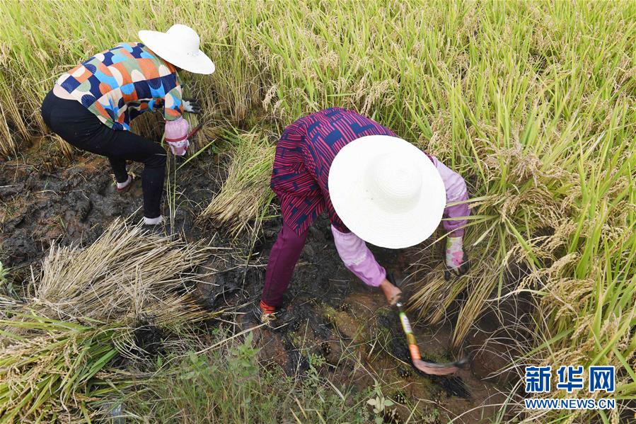 9月15日,云南尋甸回族彝族自治縣七星鎮(zhèn)魯古村的農婦在參加割稻谷比賽。 新華社記者 楊宗友 攝