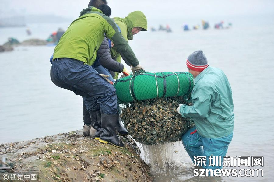 遼寧長海漁民打撈牡蠣 場面壯觀!