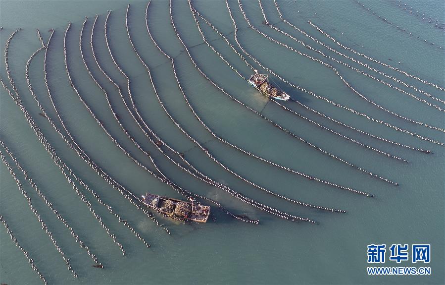 9月23日,漁民在捕撈牡蠣(無(wú)人機(jī)拍攝)。新華社記者龍雷攝