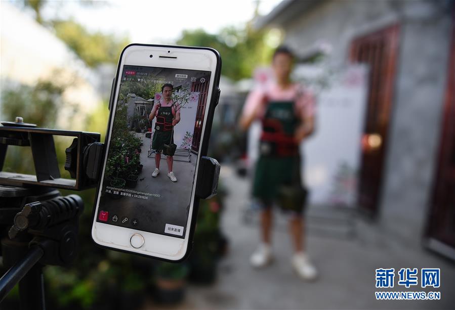 張炎在位于沭陽(yáng)縣新河鎮(zhèn)新槐村的家中直播銷(xiāo)售月季花(8月24日攝)。 新華社記者 李響 攝
