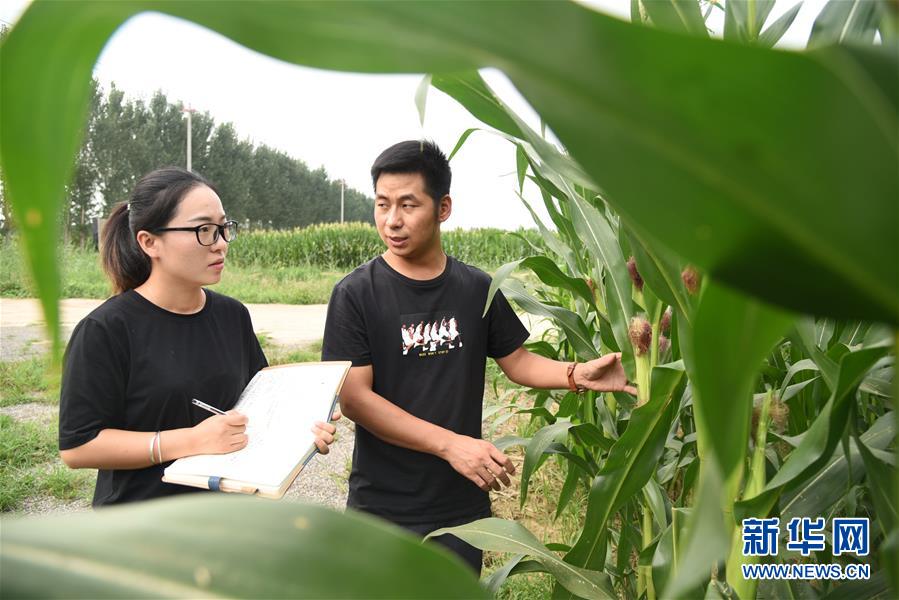 在山東省德州市平原縣的農(nóng)場(chǎng)玉米地里,楊春雷(右)和卜璐璐查看玉米的長(zhǎng)勢(shì)并監(jiān)測(cè)病蟲(chóng)害狀況(8月22日攝)。 新華社記者 王凱 攝