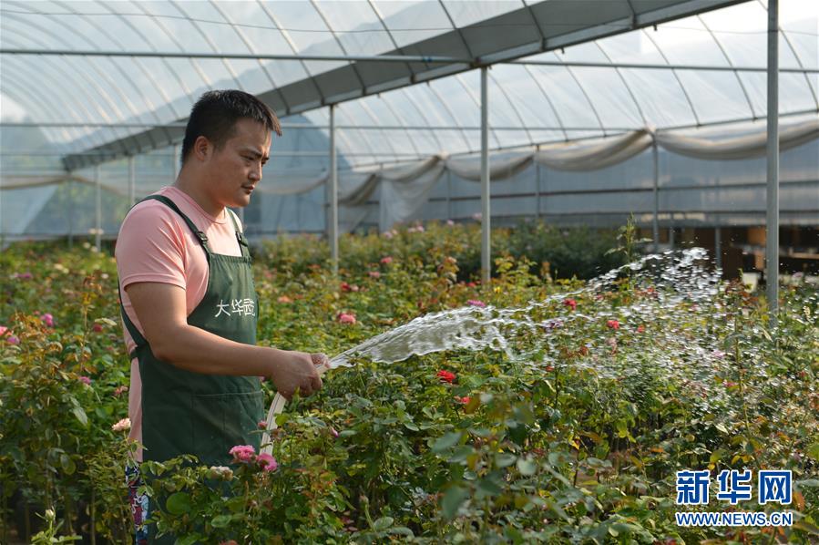 在沭陽(yáng)縣新河鎮(zhèn)新槐村,張炎在花卉大棚內(nèi)給月季花澆水(8月24日攝)。 新華社記者 任鵬飛 攝