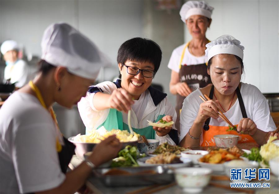 李琛璨(中)在車(chē)間中與工人們一起用午餐(8月30日攝)。新華社記者 王松 攝