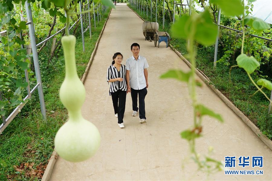 王衛(wèi)花(左)與丈夫王曉東走在葡萄園中(8月21日攝)。 新華社記者 邵瑞 攝