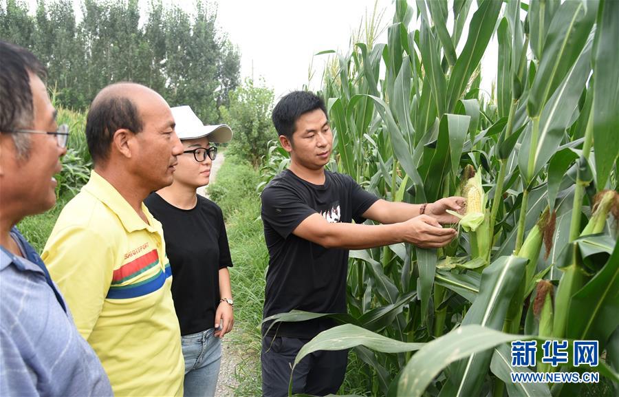在山東省德州市平原縣的農(nóng)場(chǎng)玉米地里,楊春雷(右一)、卜璐璐(右二)指導(dǎo)當(dāng)?shù)剞r(nóng)戶學(xué)習(xí)有關(guān)科學(xué)種植的知識(shí)(8月22日攝)。 新華社記者 王凱 攝
