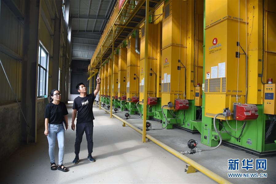 在山東省德州市平原縣的農(nóng)場(chǎng)里,楊春雷(右)和卜璐璐在烘干車(chē)間查看引進(jìn)的高科技設(shè)備——低溫循環(huán)式谷物干燥機(jī)(8月22日攝)。 新華社記者 王凱 攝