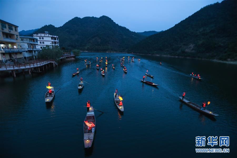 9月25日,在宋村鄉(xiāng)云源港的水面上,漁民劃著漁船,船頭點(diǎn)亮漁燈,構(gòu)成一幅“漁舟唱晚、萬(wàn)家燈火”的美麗圖景。 新華社記者 徐昱 攝