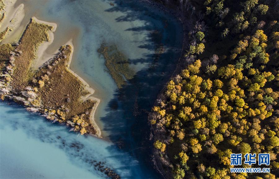 9月25日無人機(jī)拍攝的喀納斯景區(qū)風(fēng)光。 新華社記者 王菲 攝