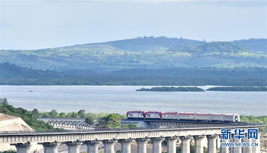 2017年5月29日,一列肯尼亞蒙內(nèi)鐵路測(cè)試列車行駛在蒙巴薩特大橋上。由中國(guó)承建的蒙巴薩-內(nèi)羅畢標(biāo)軌鐵路(蒙內(nèi)鐵路)全長(zhǎng)約480公里,于2017年5月通車。新華社記者孫瑞博攝