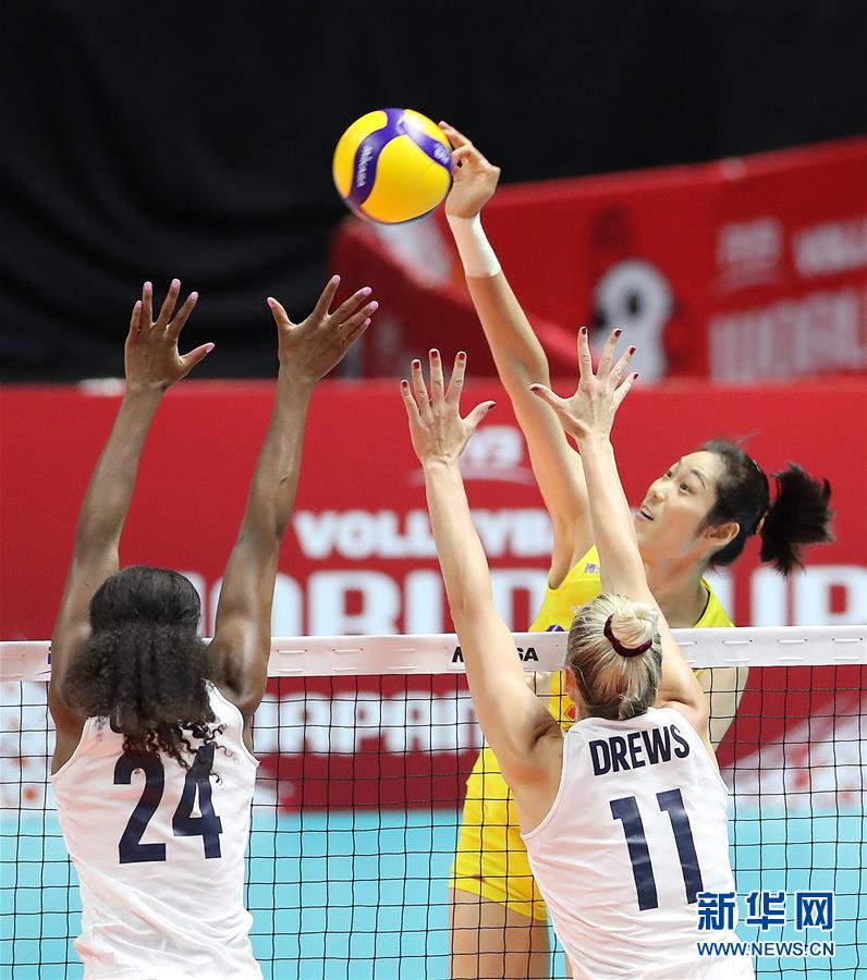 9月23日,中國(guó)隊(duì)球員朱婷(右)在比賽中扣球。當(dāng)日,在日本札幌舉行的2019年女排世界杯賽第二階段A組循環(huán)賽中,中國(guó)隊(duì)以3比0戰(zhàn)勝美國(guó)隊(duì)。新華社記者杜瀟逸攝
