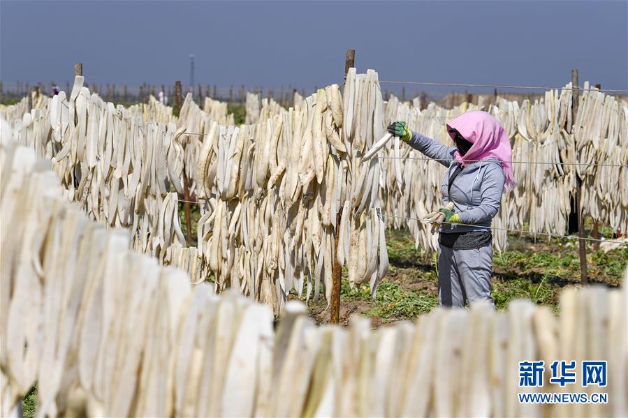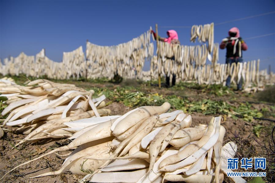 9月30日,寧夏吳忠市紅寺堡區(qū)馬渠生態(tài)移民安置區(qū)的農民在晾曬蘿卜。新華社記者 馮開華 攝