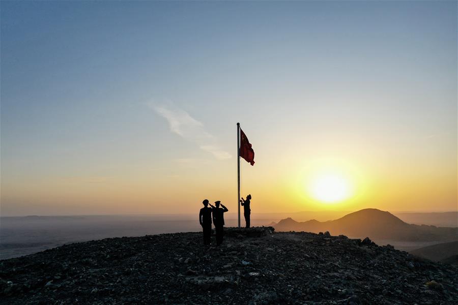 9月27日,內(nèi)蒙古自治區(qū)額濟納旗算井子邊境派出所民警在大紅山上舉行升國旗儀式(無人機拍攝)。新華社記者劉磊攝
