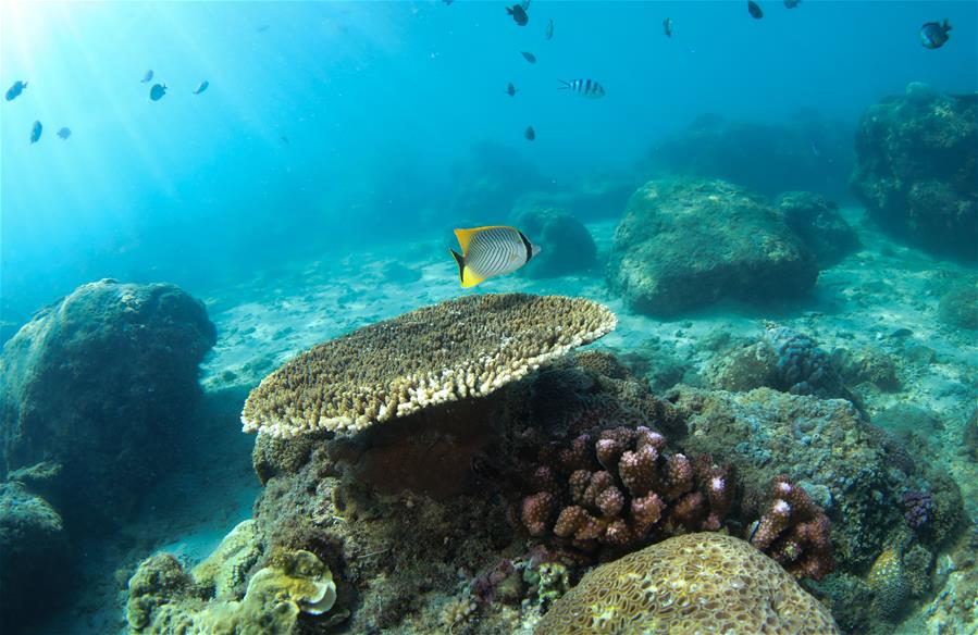 10月5日,在分界洲島海域,魚兒在珊瑚附近游動覓食。新華社記者楊冠宇攝