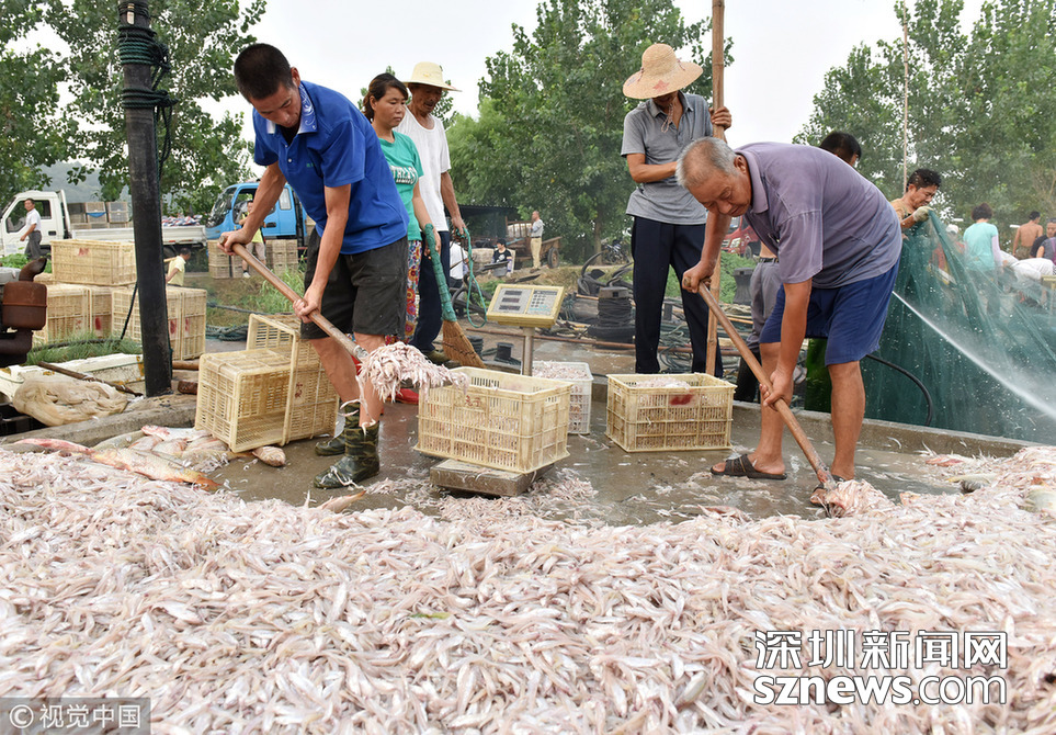 2018年8月16日,安徽巢湖漁民正在裝運捕撈上來的毛魚和銀魚。