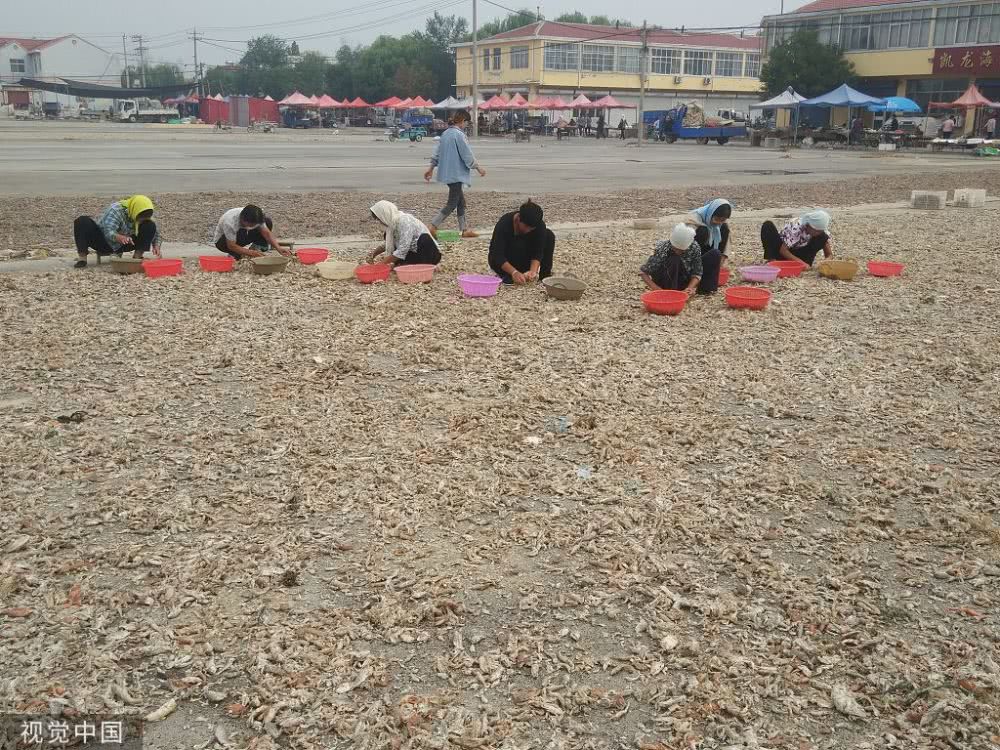 渤海灣畔海產(chǎn)豐收,成群魚蝦分揀后當(dāng)街晾曬,場面賽曬糧食