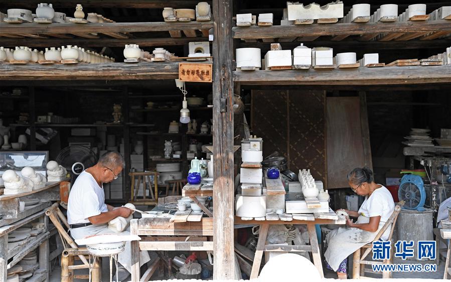 在江西景德鎮(zhèn)御窯廠遺址附近的一處老窯廠內(nèi),工匠們在制作瓷器(2018年9月20日攝)。新華社記者 萬象 攝