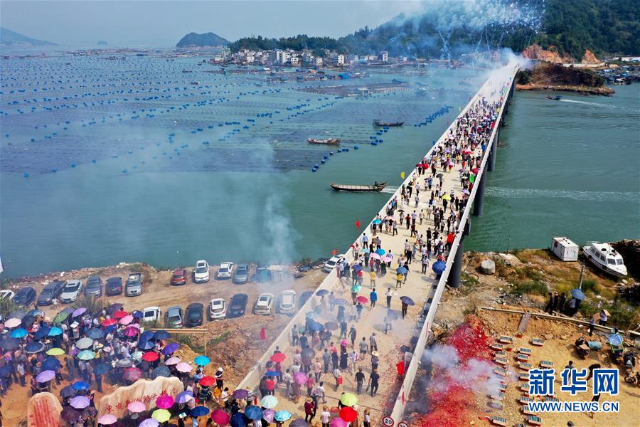10月12日,福建省霞浦縣東安島海防大橋正式通車,這是當(dāng)?shù)厝罕娮咴谛聵蛏希o(wú)人機(jī)拍攝)。新華社記者姜克紅攝