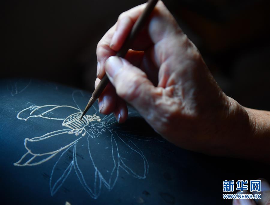 10月12日,丁國坤在家中對一件未成形的脫胎漆器進行“彩繪”工序。新華社記者胡晨歡攝