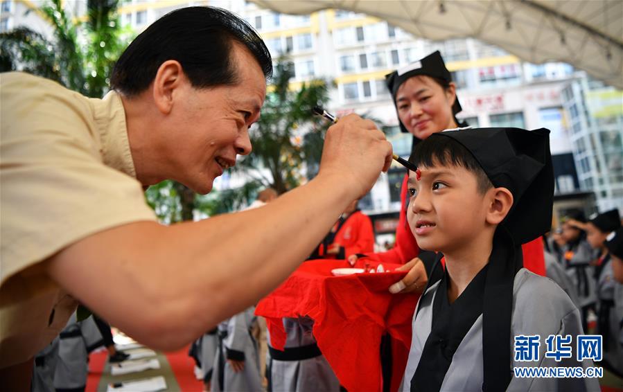 10月13日,參加儀式的嘉賓為小朋友“點(diǎn)朱砂”。當(dāng)日,??诤嬌賰核囆g(shù)中心為500名小朋友舉行“開筆禮”,通過“點(diǎn)朱砂,啟智慧”“習(xí)書法,描人字”等儀式讓孩子們體驗(yàn)中國傳統(tǒng)文化。新華社記者郭程攝