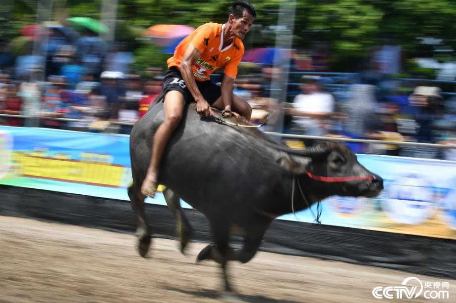 當(dāng)?shù)貢r(shí)間2019年10月12日,泰國(guó)春武里舉行一年一度的水牛賽跑,選手騎??癖?。視覺(jué)中國(guó)