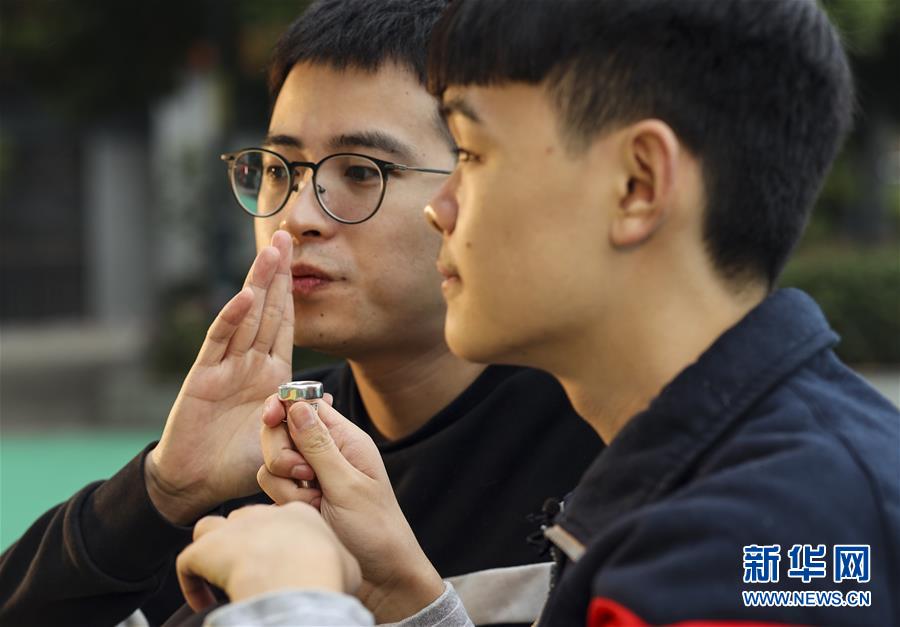 重慶市特殊教育中心老師李沂念(左一)在教授盲童王太樊練習(xí)小號吹奏的氣息(10月10日攝)。 新華社記者 劉潺 攝