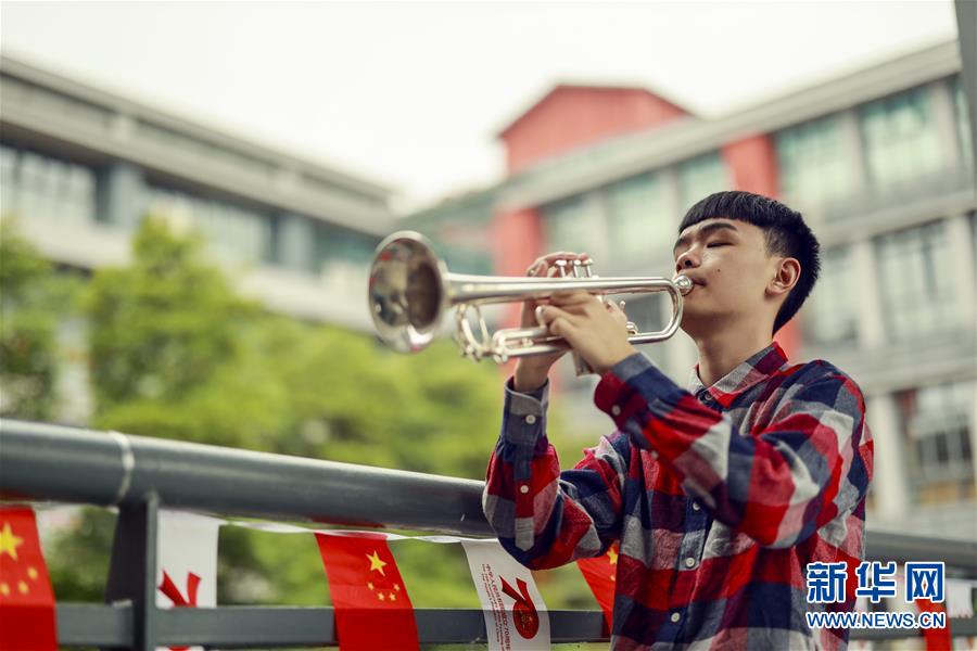 王太樊在教室外的樓道給自己心愛的小號(hào)試音(10月10日攝)。 新華社記者 劉潺 攝