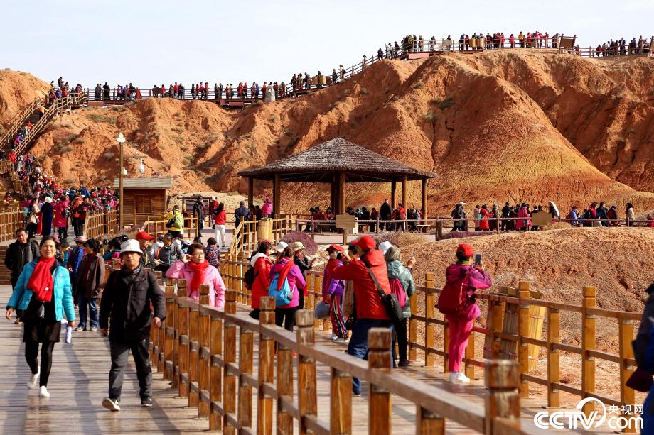 央視網(wǎng)消息:2019年10月15日,金秋時節(jié),位于甘肅省張掖市臨澤縣的七彩丹霞景區(qū)進(jìn)入旅游旺季,吸引眾多游人紛至沓來。張掖七彩丹霞景區(qū),分布面積約50公里,是中國北方干旱地區(qū)發(fā)育最典型的丹霞地貌。在方圓數(shù)十平方公里的范圍內(nèi),隨處可見有紅、黃、橙、綠、白等多種鮮艷的色塊或線條,把一座座山峰,一條條溝壑,裝點成一幅幅絢麗多姿、燦爛奪目的畫圖。圖片來源:視覺中國