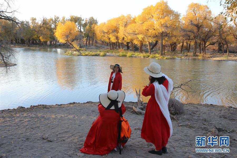 10月10日,在內(nèi)蒙古自治區(qū)額濟(jì)納旗,游客在胡楊林前留影。金秋時(shí)節(jié),內(nèi)蒙古自治區(qū)額濟(jì)納旗胡楊林如同披上金裝,成為大漠中的一抹亮色,吸引眾多中外游客前來觀賞游玩。新華社記者安希雅攝