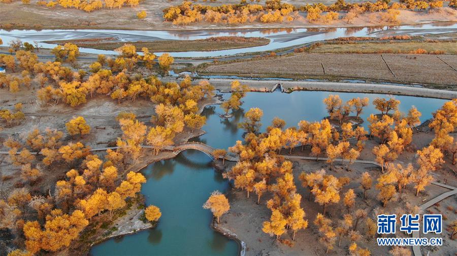這是在內(nèi)蒙古自治區(qū)額濟納旗拍攝的胡楊林(10月10日無人機拍攝)。金秋時節(jié),內(nèi)蒙古自治區(qū)額濟納旗胡楊林如同披上金裝,成為大漠中的一抹亮色,吸引眾多中外游客前來觀賞游玩。新華社記者鄒予攝